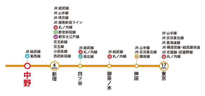 JR中央線 、JR総武線、東京メトロ東西線「中野」駅より徒歩5分