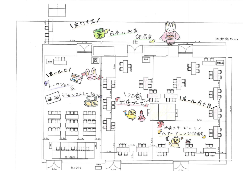 イベント当日は、ホールA+Bにて、合計22の出店ブースを設置し、メイクブラシやヘアブラシの販売も
