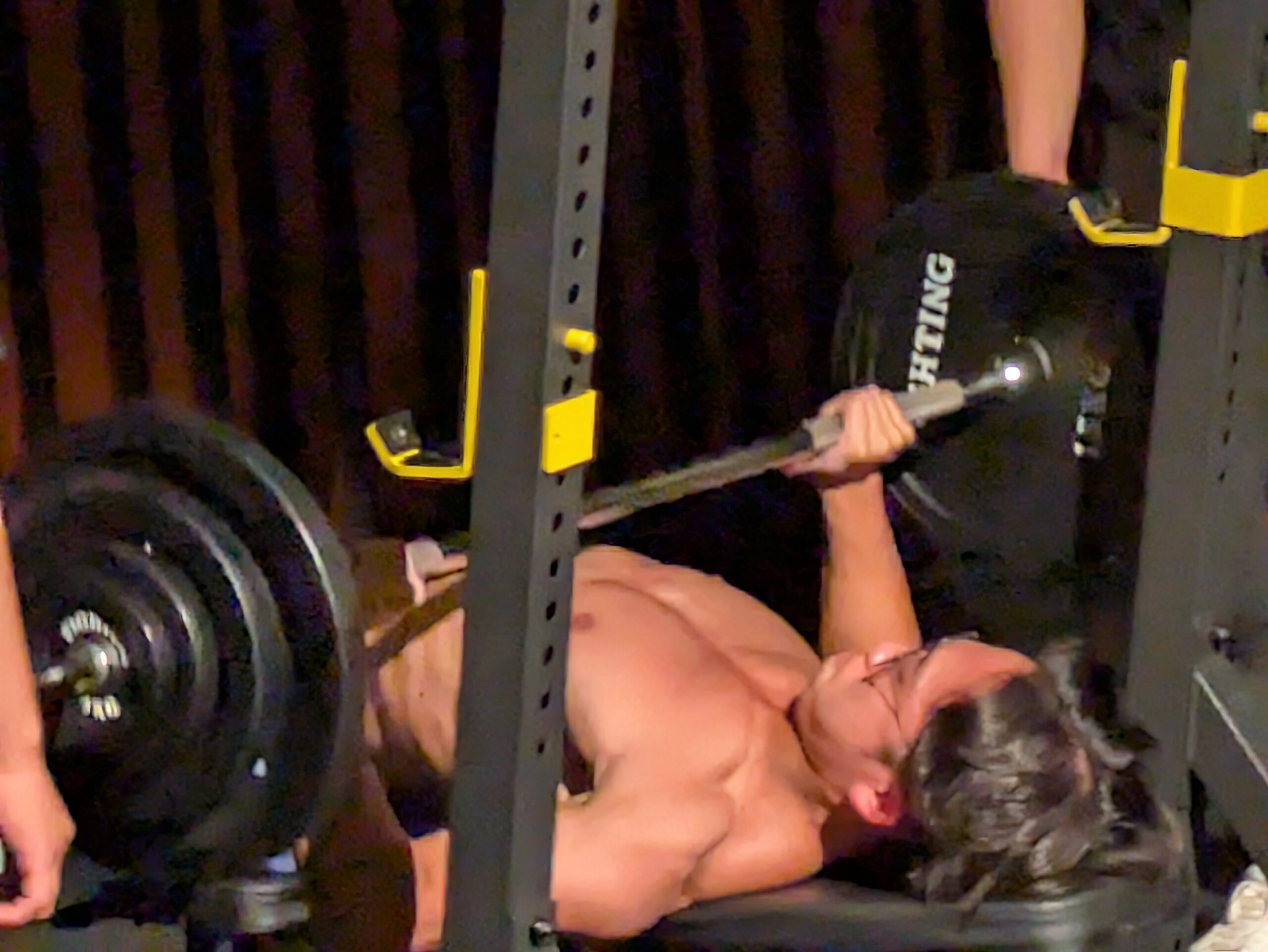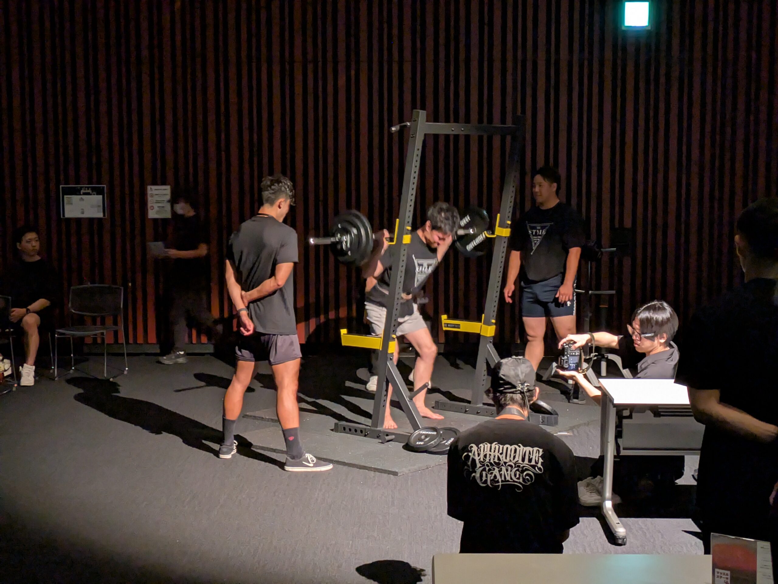 トレーナーの掛け声とともに、ベンチプレスやスクワットの回数を競い合っていました。