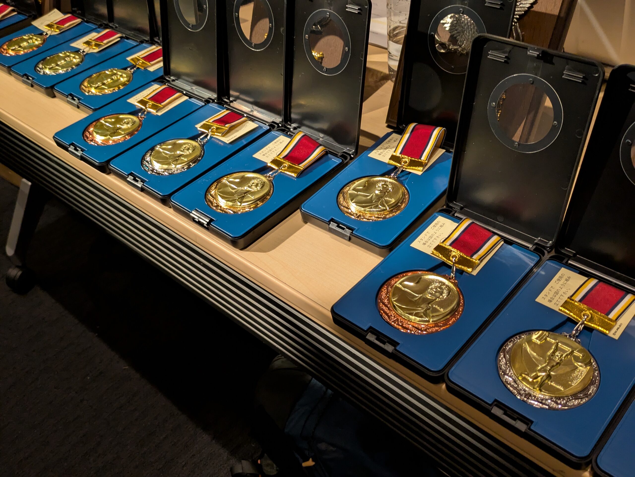 審査員による選考が始まり、ステージの横には数々のメダルが準備されます。