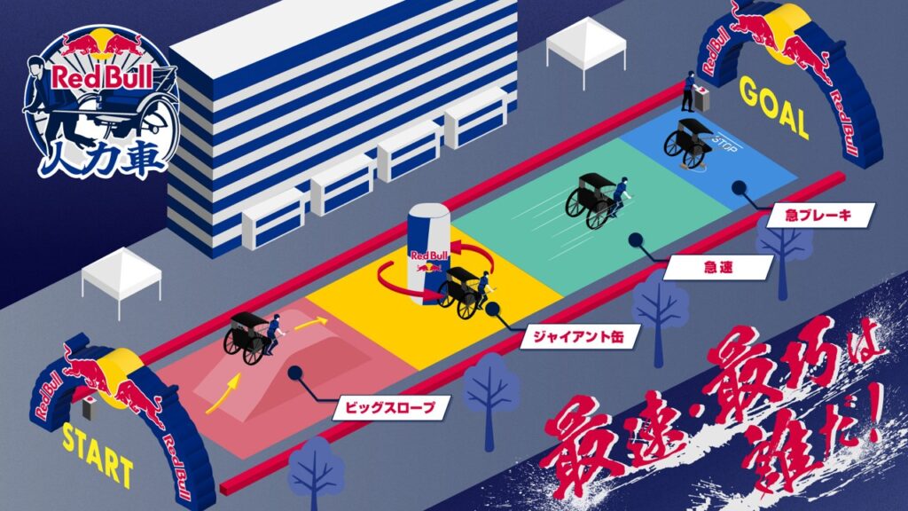 コースは100mで途中に傾斜があるビッグスロープ、巨大レッドブルオブジェを回るジャイアント缶、急加速・急ブレーキが必要なゾーンなどレッドブルならではの仕掛けがほどこされたコースで、イベントが盛り上がること間違いなし!
