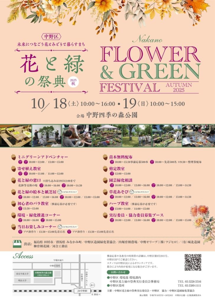 土日は中野セントラルパーク パークアベニューにて『自然栽培フェア2025』、中野四季の森公園芝生エリアにて『花と緑の祭典』が開催され、10/19(日)は中野四季の森公園イベントエリア北側にて『アシバ祭』も行われます。