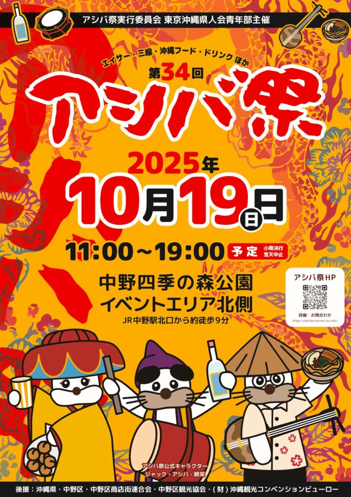 「アシバ」とは沖縄の方言で“みんなで遊ぼうよ”という意味の“遊ば(あしば)”と、沖縄出身の青年の“足場”を築こうという意味で名づけられ、1985年の第1回から東京沖縄県人会青年部が続けて来たイベントです。