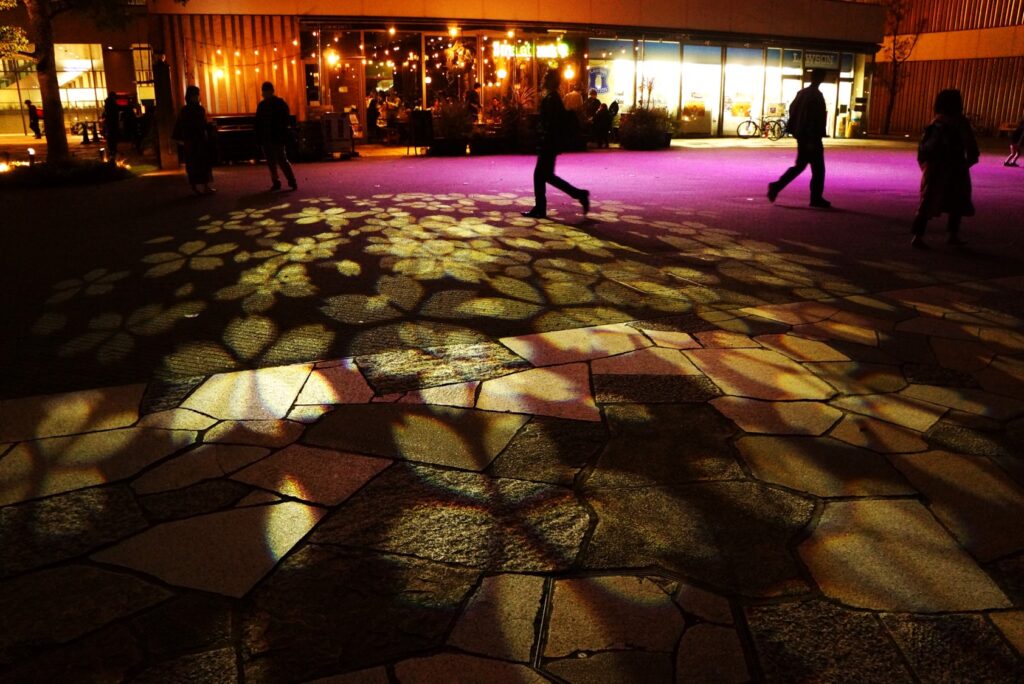 ・桜の柄が1時間に1回(00分に5分間)地面に投射されます。
