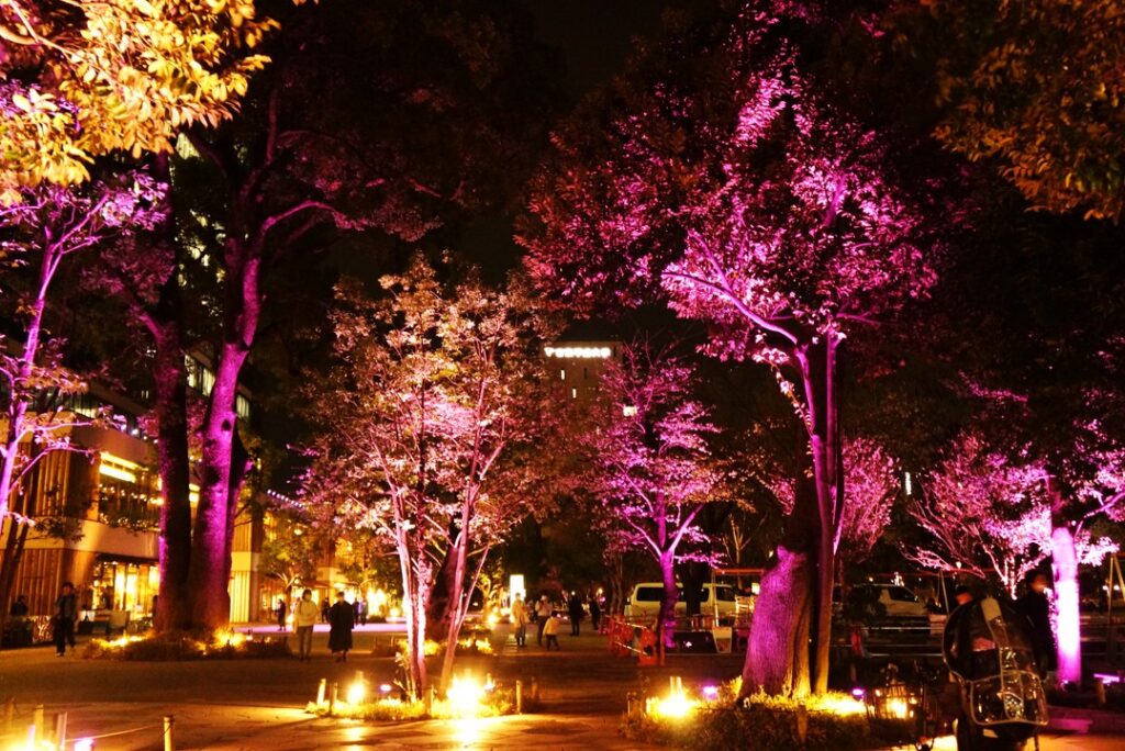 ライトアップではパークアベニュー全体が桜色に染まり、より桜の花を楽しめるよう光の演出があり、1時間に1回の頻度で地面に桜の柄が投射される特別演出もございます。