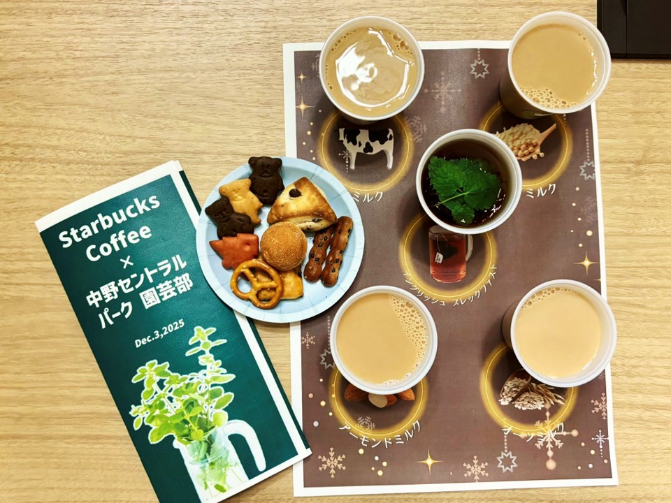 今回のお茶会もサウス1階のカフェ「スターバックスコーヒー 中野セントラルパーク店」ご協力のもと、紅茶とミルクの組み合わせを楽しむイベントを行いました。